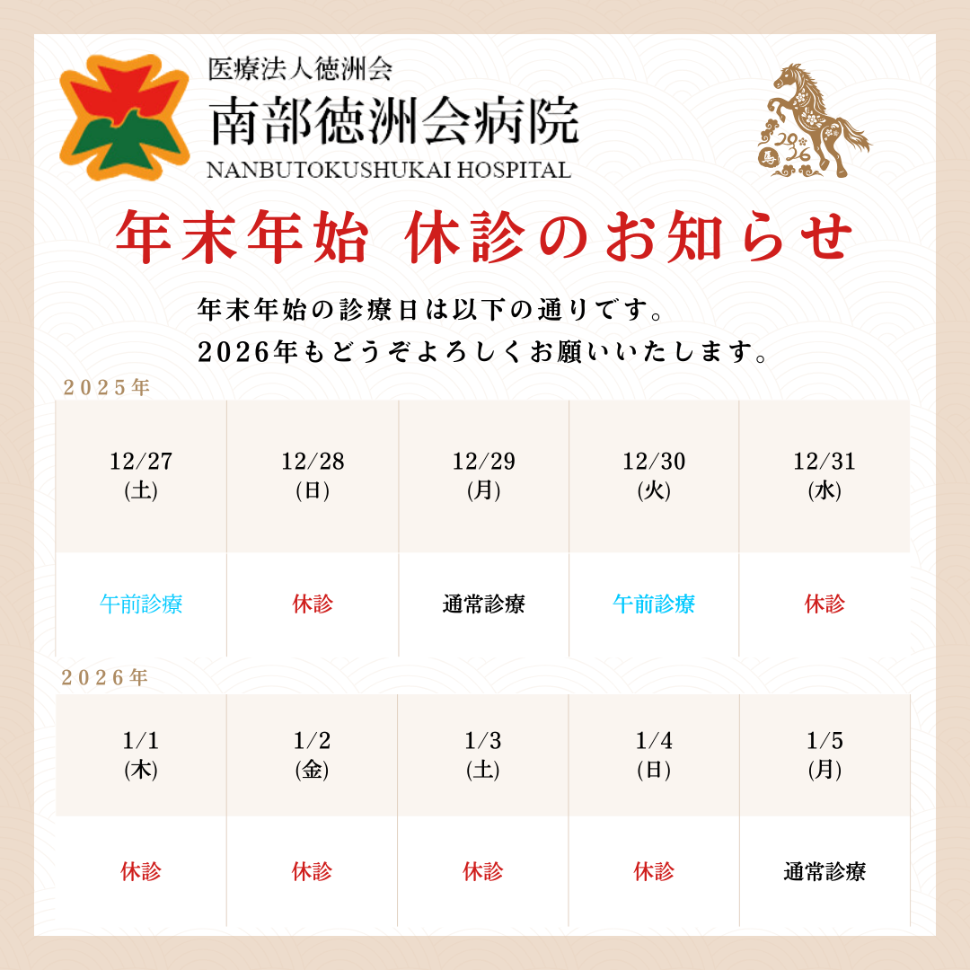 Please be advised that our hospital will be closed for regular outpatient services from the afternoon of Tuesday, December 30, 2025, through Sunday, January 4, 2026.