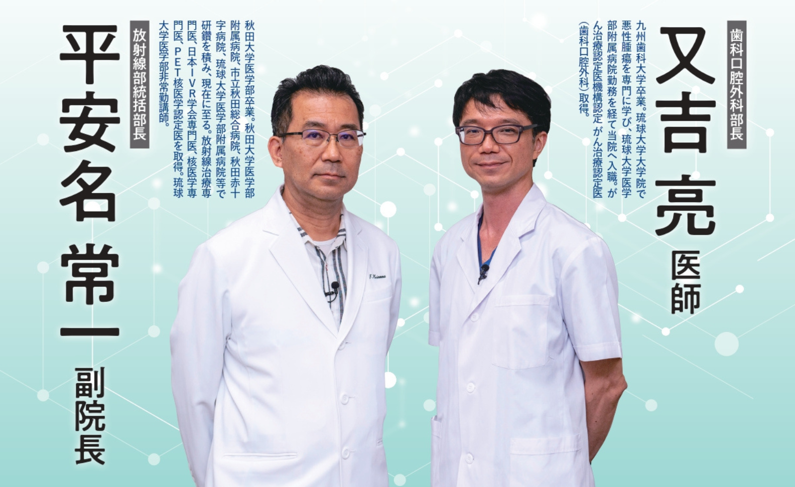 人口10万人あたり6例未満の希少がんといわれる口腔がん。当院では手術に加え、動注化学療法と放射線治療を組み合わせた動注化学放射線療法を用いた治療を行っています。今回は、口腔外科の治療に携わる歯科口腔外科部長の又吉亮医師と、動注化学療法でこれまで様々な種類のがんを治療してきた放射線部統括部長の平安名常一副院長に、口腔がん治療について話を伺いました。