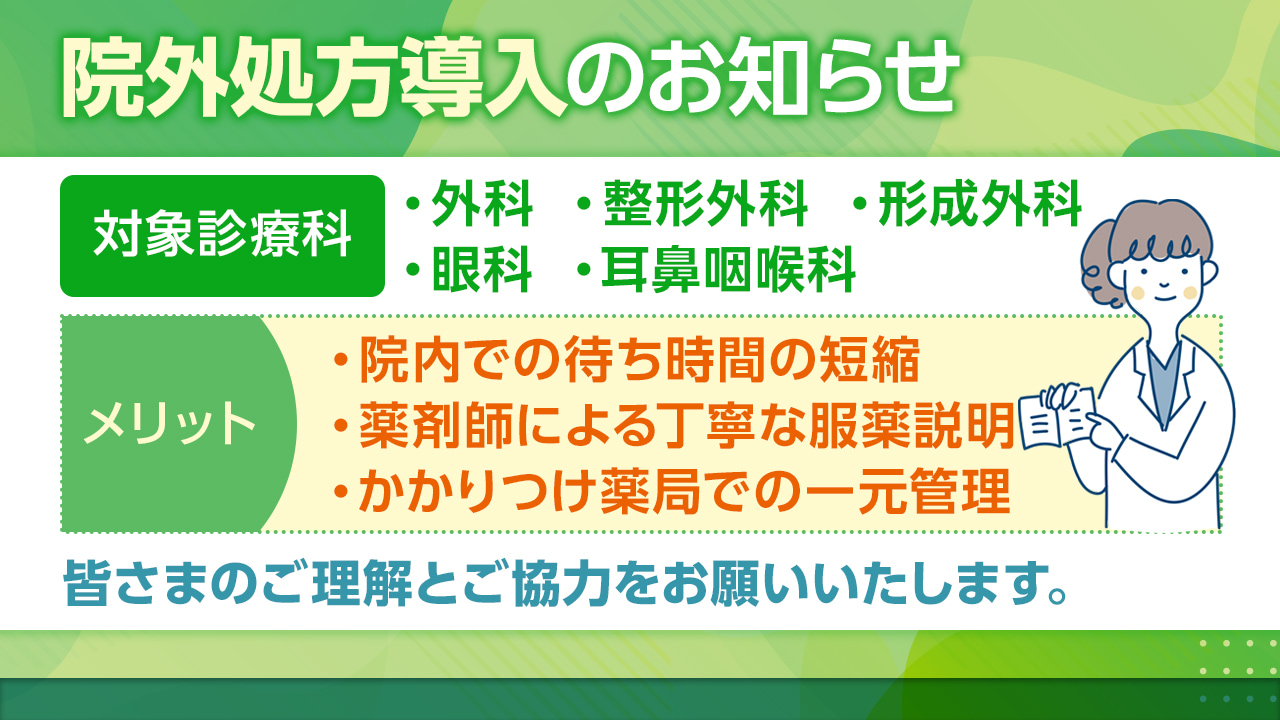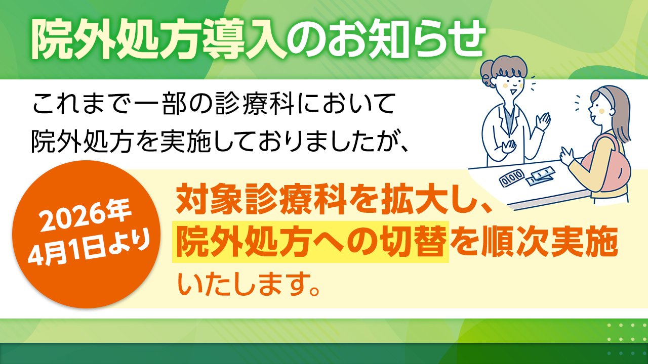 これまで一部の診療科において院外処方を実施しておりましたが、2026年4月1日より、対象診療科(外科・整形外科・眼科・耳鼻咽喉科・形成外科)を拡大し、院外処方への切替を順次実施いたします。