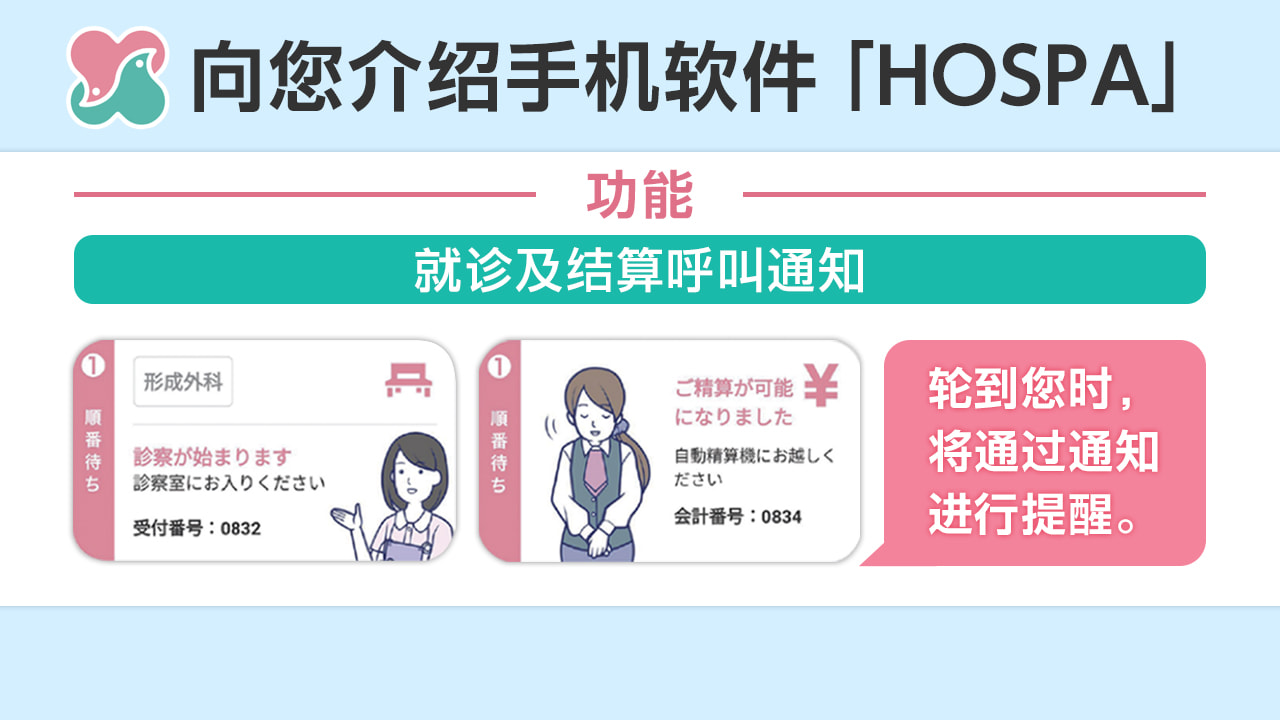 HOSPA应用内包含诊察、结算、取药等呼叫通知及预约管理等多种便利功能。
