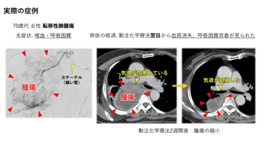 動注化学療法はがんの症状緩和を目的とした治療法です。 標準治療後の再発、その後の救済治療法が見つからない患者さまが主な対象となります。