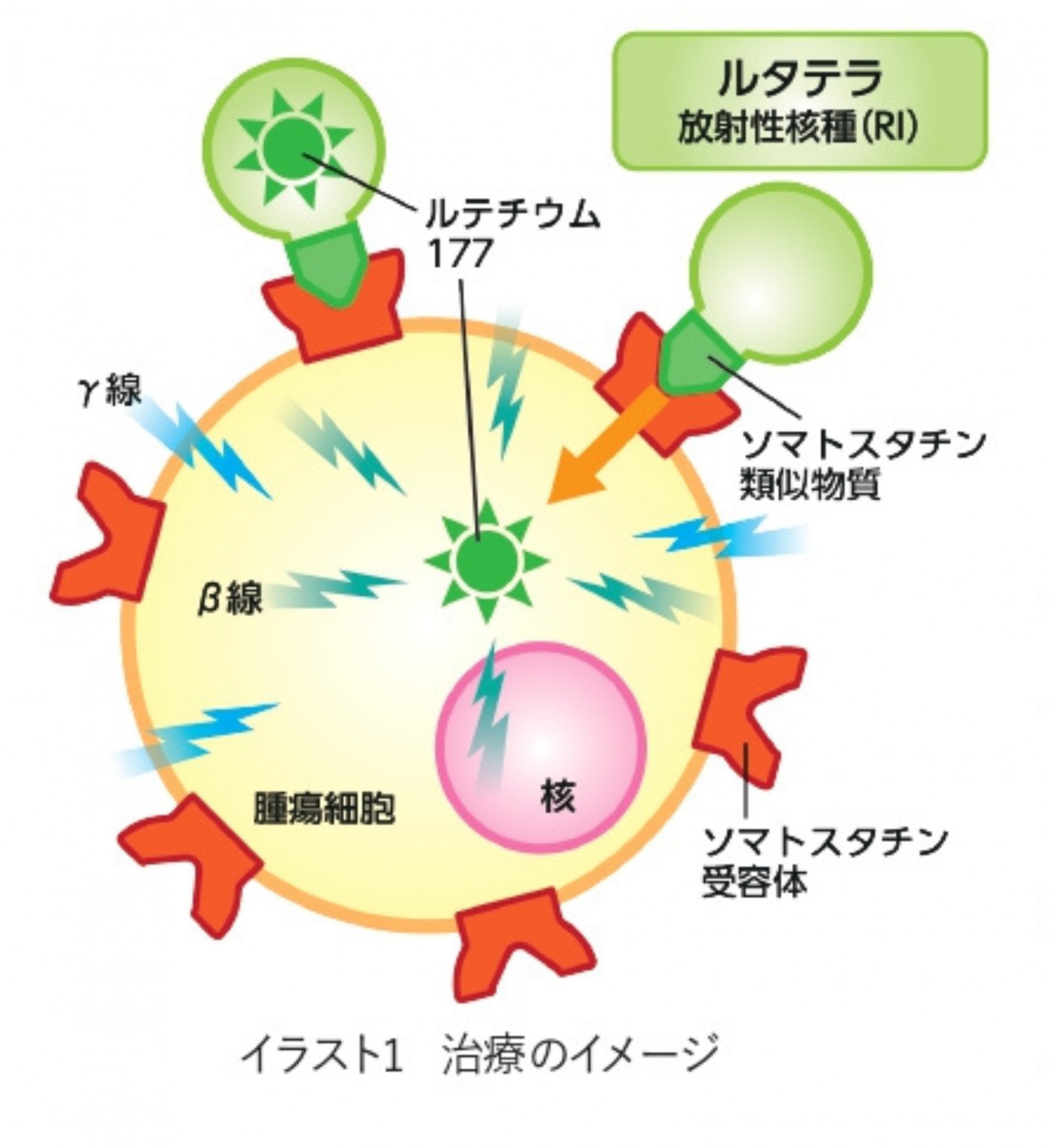 神経内分泌腫瘍細胞の表面には、ホルモンの一種であるソマトスタチンが結合するソマトスタチン受容体が高頻度で発現することがわかっています。ルタテラはソマトスタチンの類似物質に放射線を放出する核種(ルテチウム177)を結合させた医薬品で、体内に点滴で投与されると腫瘍細胞表面に存在するソマトスタチン受容体にルタテラが特異的に結合します。そして結合したルタテラは腫瘍細胞内に取り込まれ、細胞内でルテチウム177から放射線(β線やγ線)が放出される仕組みとなっています(イラスト1参照)。しかし、ソマトスタチン受容体は全ての神経内分泌腫瘍に発現する訳ではなく、事前の検査によってソマトスタチン受容体の存在が確認できた場合に限り適用となります。この治療法のもう一つの特徴は腫瘍表面のソマトスタチン受容体に結合しなかったルタテラは速やかに対外へ排出され、体内にほとんど残らないということです。さらに治療の主体となるβ線は体内では数ミリ程度の範囲しか届かないため、がん以外の正常な臓器への影響を最小限に抑えることができます。ただ、β線と同時に放出されるγ線は体外へ出てくるため、ルテララの投与後は、体内の放射線量が周囲に影響を及ぼさない基準値以下になるまでは特別措置室で12泊程度の入院をしなければなりません。その間、患者さまは部屋の外に出ることはできませんし、また、他の人も部屋に入ることができないため、トイレや食事など、身の回りのことは患者さまご自身で行う必要があります。