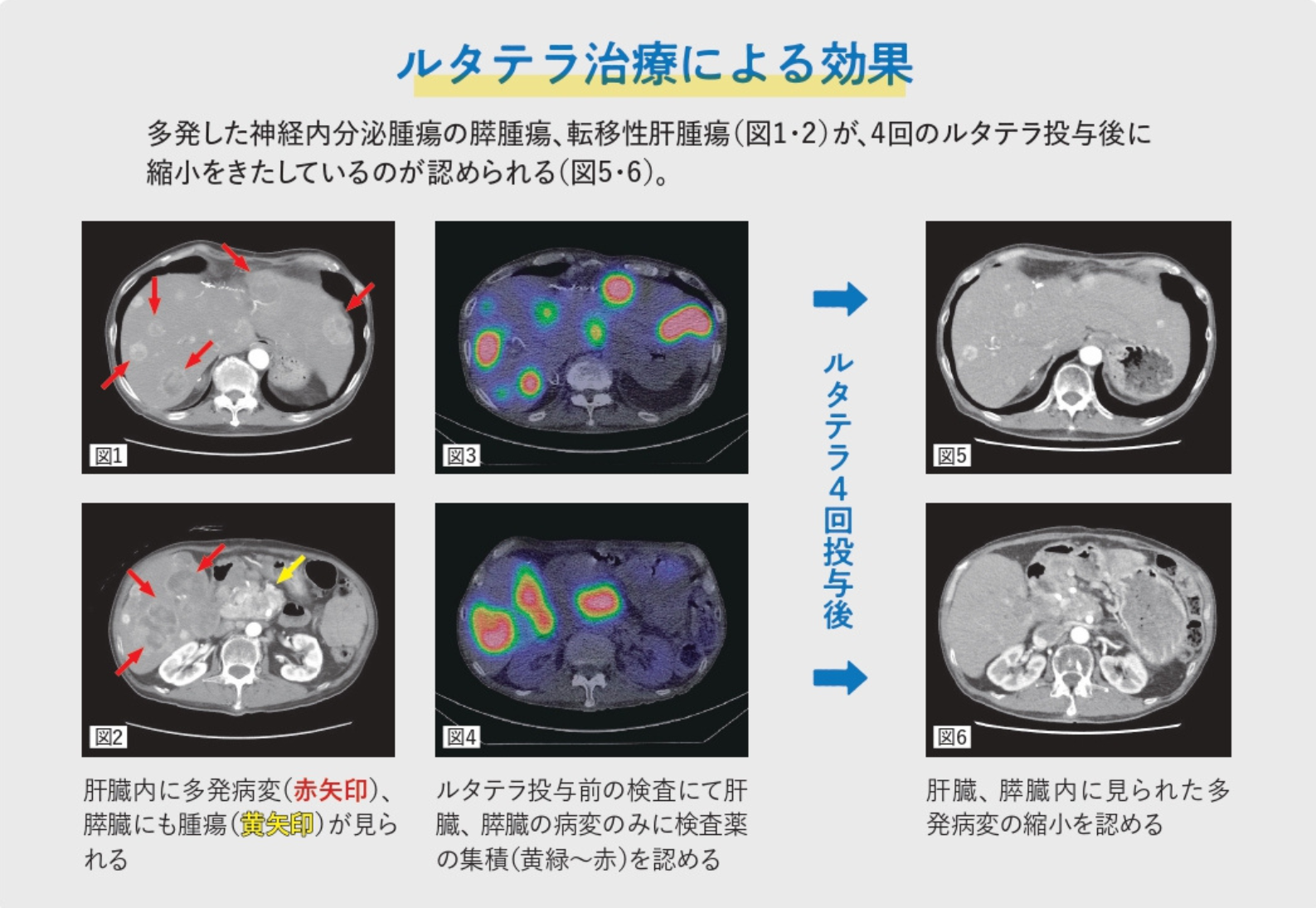 ルタテラとは、放射性物質(ルテチウム177)を含んだ医薬品の一つで、2021年8月に治療が保険適用となりました。点滴にて投与したルタテラが病変にのみ選択的に取り込まれて腫瘍の内部でルテチウム177から放射線が放出される放射線治療の一種です。治療の対象となる疾患は、神経内分泌腫瘍です。この病気は、100万人に約10人の割合で発症する希少がんの一つで、全身に分布する神経内分泌細胞から発生します。小腸や大腸、膵臓、肺といった多くの臓器に発生するのが特徴です。これまで、神経内分泌腫瘍に対しては手術か、あるいは手術ができない場合に病勢の進行を抑えることを目的とした薬物療法が行われてきました。しかし、抗がん剤を含む薬物療法を行った場合は悪心や嘔吐、貧血などさまざまな副作用があり、治療を継続する事が困難となる場合が少なからず存在します。一方、ルタテラによる内用療法は治療に伴う副作用が比較的少なく、これまでとほとんど変わらない日常生活を送れるほか、腫瘍を縮小させ病巣の進行を抑制する効果が確認されています(左ページ下の写真参照)。神経内分泌腫瘍の治療ガイドラインでは、治療の第一選択は手術となっており、手術が困難な場合は薬物療法を行うこととされています。また、薬物療法でも効果が得られない場合はルタテラによる内用療法を行うこととされていますが、放射線内用療法は身体への負担が少ないことから、近い将来は薬物療法の前に行うことも検討されています。