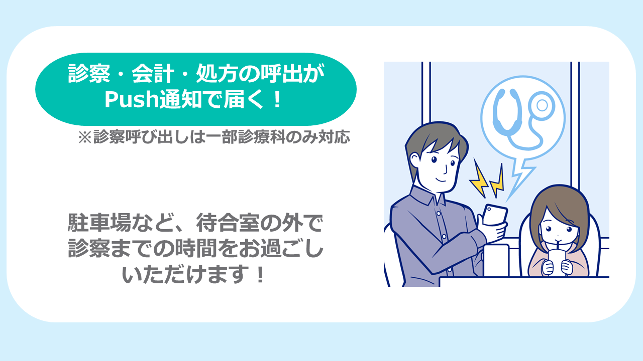 診察・会計・処方の呼び出し通知や予約管理など、便利な機能が満載です。