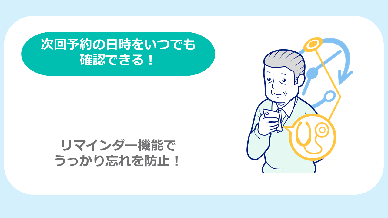 さらに、次回予約の確認やリマインダー、ご家族の診療予定の管理や健康情報の記録など、日常生活にも役立つ便利な機能を多数ご用意しています。